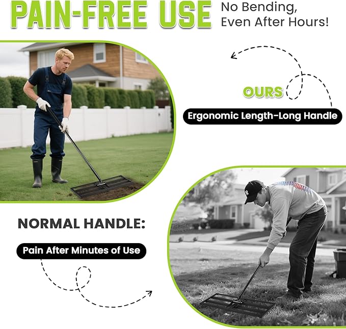 - 2. Damage-Free Leveling with Secure Grip Curved edges prevent grass tearing while leveling soil/sand/dirt. Paired with non-slip gloves, users maintain full control of this lawn rake during operation – achieve flawless surfaces without flipping or lawn scratches.