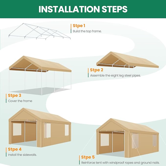 - 【Heavy Duty Structure】 This 10x20 carport tent features a rust-proof powder-coated steel frame, designed to resist chipping, peeling, rusting, and corrosion. Equipped with 8 sturdy legs made from 1.5-inch galvanized steel pipes and integrated sandbags, this portable garage ensures enhanced safety and stability.