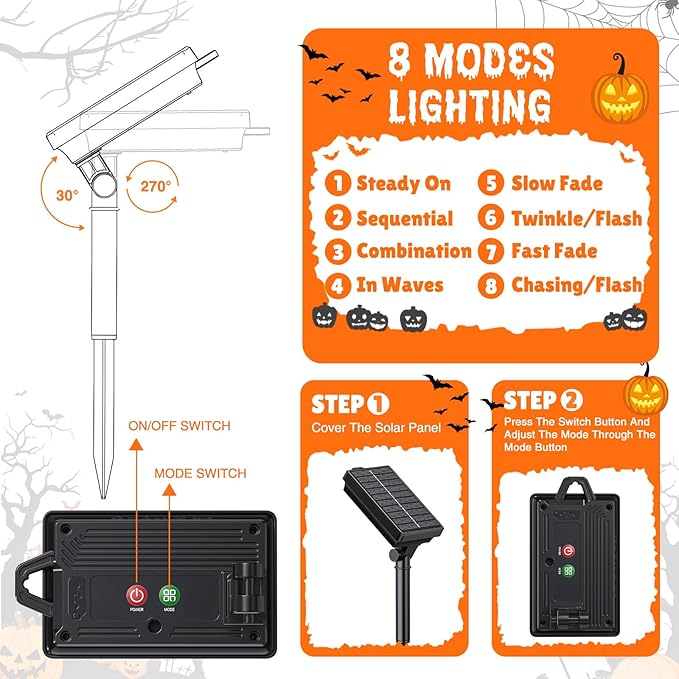 - 【8 Modes and Memory Function】Unlike other single-mode Halloween lights, these solar Halloween lights for yard decor are designed with 8 dynamic lighting modes to satisfy your diverse needs. Just press the mode button at the back of the solar panel. And the built-in memory chip saves your last modes setting, so there is no need to reset it on your next turn-on. Add Festive Touch for Halloween decorations outdoor. Nice & Funny Way to Decorate Your home to Welcome Trick-or-treaters or Party Guests