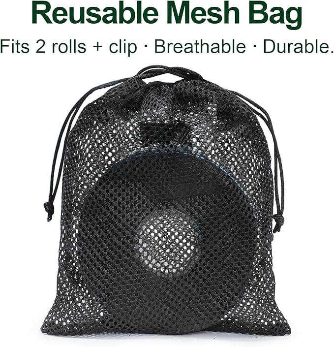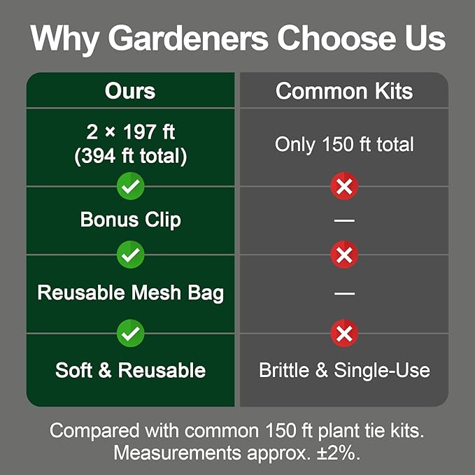 - What You Get & Size Note – 2 rolls of green plant tie tape (0.5 in wide × 197 ft each; 394 ft total) plus mesh storage bag and binder clip. Measurements approx. ±2%