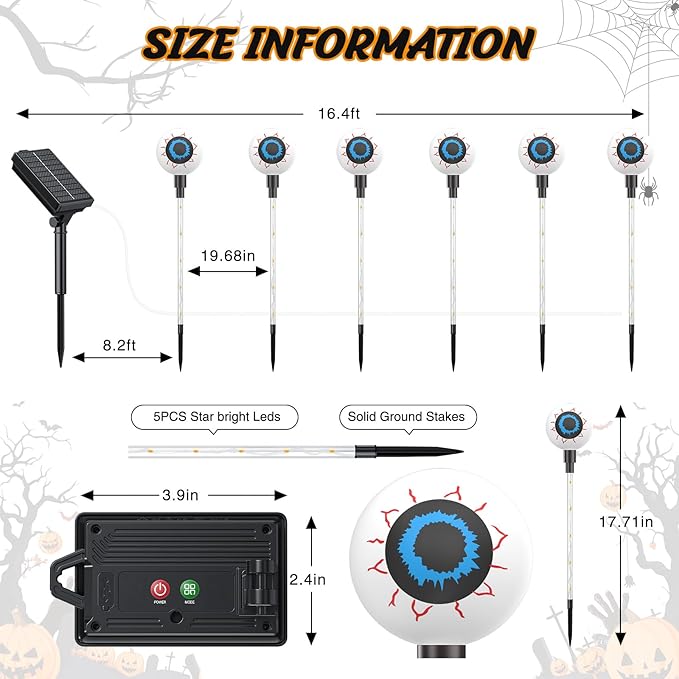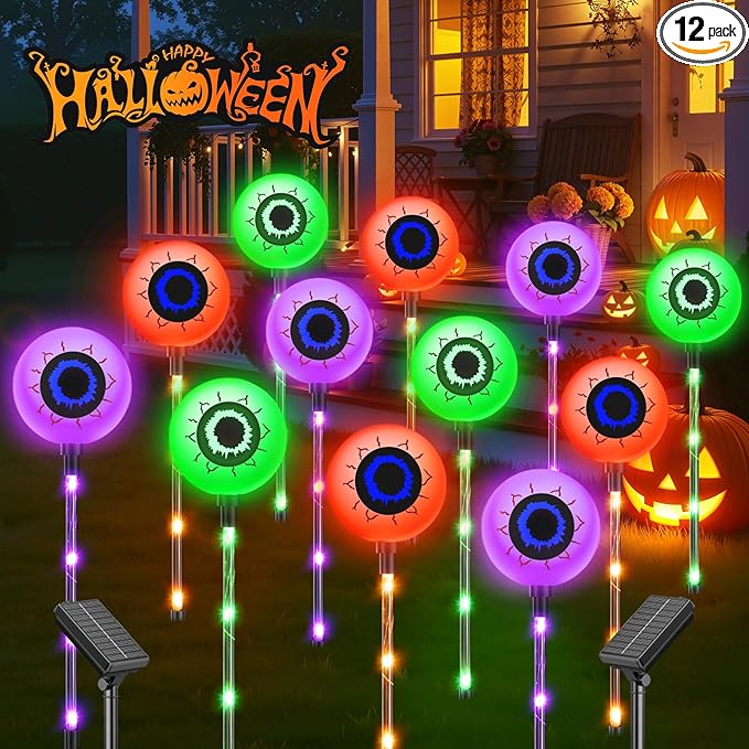 - 2025 Halloween Decorations Upgraded Scary Eyeballs: 12Pack solar halloween lights glowing eyes feature transparent tubes built-in colorful small LED beads, shining in 3 colors: Orange, Purple and Green. New Halloween outdoor lights use large and bright bulbs in the shape of eyeballs, with 8 dynamic lighting modes to choose from, bringing a funny & scary landscape to your yard decorations and spooky atmosphere for Halloween Decor. Celebrate Halloween night with these unique solar eyeballs lights