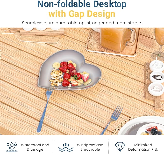 - 【Sturdy and Durable Construction】Our patio dining table is built with a strong metal frame and features a non-folding tabletop design for enhanced stability and long-lasting reliability. Unlike folding tables, the fixed tabletop provides superior wind resistance and sturdy support. Whether in windy weather or with frequent use, it will remain solid and stable in your outdoor space.