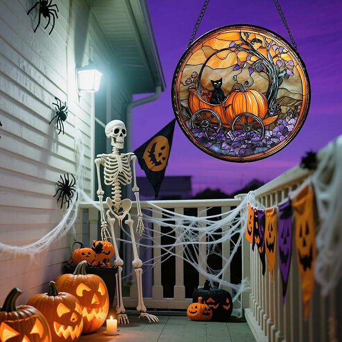 Stained Glass Window Hanging - Halloween Pumpkin Carriage Black Cat Suncatcher for Doors Window Garden Spooky Sun Catchers Gothic Decor Horror Gifts for Women Men Friend Boy Girl 7.8 in