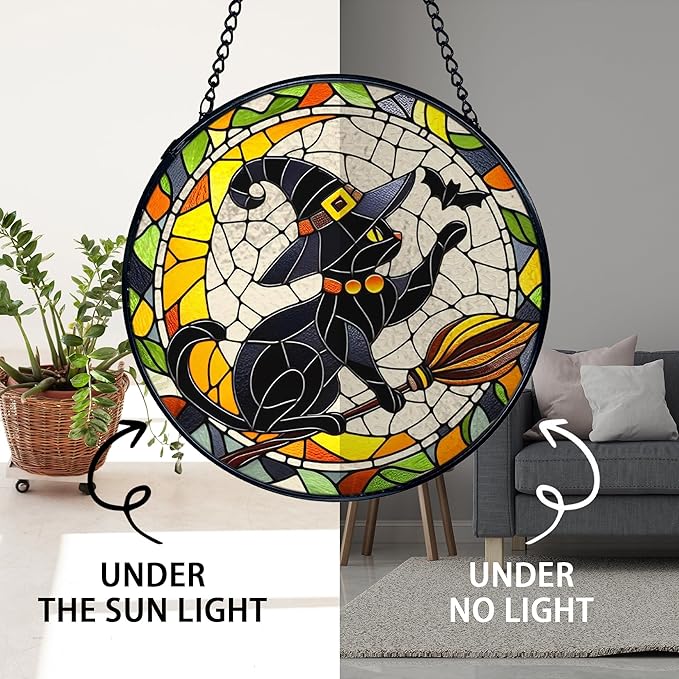 TNUW Halloween Black Cat Stained Glass Window Hanging, Gothic Witchy Black Cat Sun Catchers Indoor Window Glass Round Wall Art Decor, Halloween Wall Hanging Decorations, 7.9"x7.9"