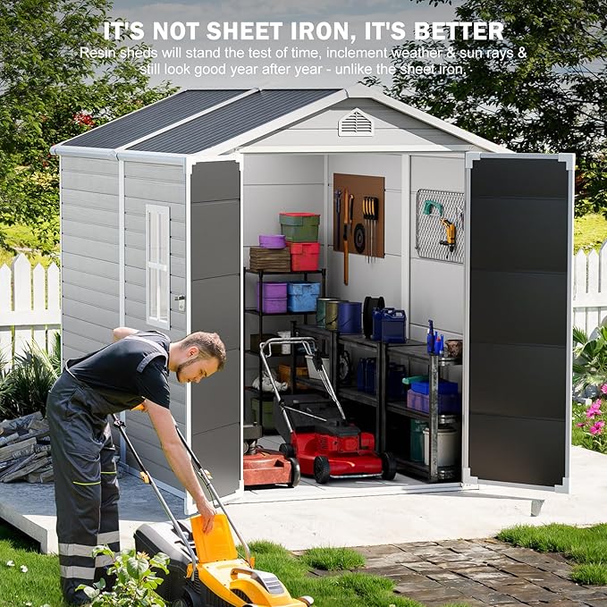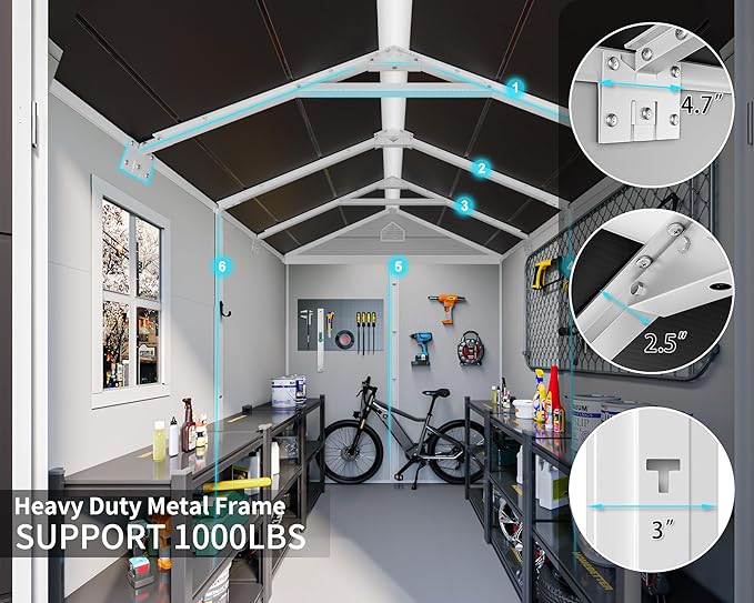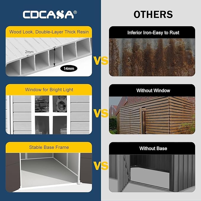 - 🏡【PREMIUM AND DURABLE Material】The 14mm tough double-wall resin construction, 0.6 mm galvanized steel frame and impact-resistant floor are designed for long-term durability. The double-wall panels are waterproof and moisture-proof, allowing worry-free use in all weather conditions. It is weather-resistant, waterproof, and UV-resistant-no peeling, rotting, or rusting. The screws are embedded to ensure aesthetics and safety.