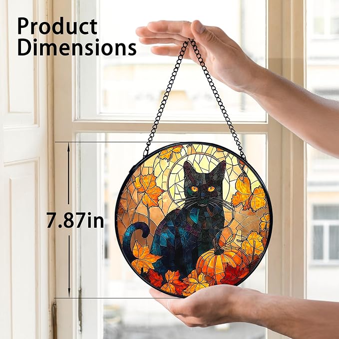 TNUW Fall Pumpkin Black Cat Stained Glass Window Hanging, Autumn Pumpkin Maple Leaf Black Cat Sun Catchers Indoor Window Glass Round Wall Art Decor, Rustic Fall Wall Hanging Decorations, 7.9"x7.9"