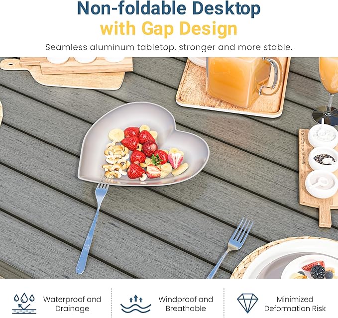 - 【Sturdy and Durable Construction】Our patio dining table is built with a strong metal frame and features a non-folding tabletop design for enhanced stability and long-lasting reliability. Unlike folding tables, the fixed tabletop provides superior wind resistance and sturdy support. Whether in windy weather or with frequent use, it will remain solid and stable in your outdoor space.