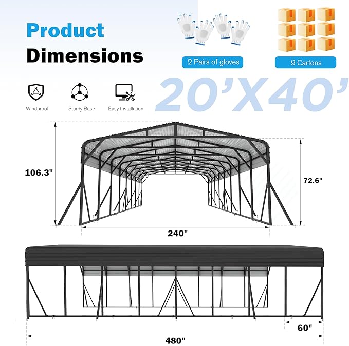 - [Spacious & Versatile Carport Design] Carports measuring 20x40x9.3 ft, this metal carport offers ample space for vehicles, equipment, or outdoor events. Carports 20x40 heavy duty versatile design works as an RV cover, storage garage, or event canopy, adapting to your needs. Carports open, heavy-duty structure ensures easy access and comfortably fits taller vehicles
