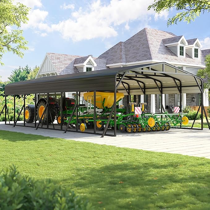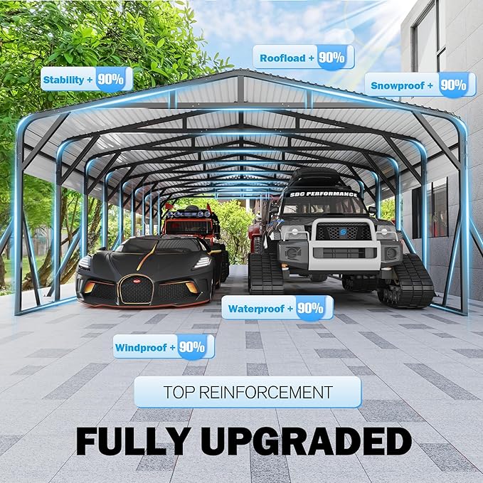 - [Durable & All-Season Metal Car port] This heavy-duty carport features a galvanized steel frame and high-strength steel roof to handle tough weather. Car port rust-resistant build, waterproof sealing, and high-peak design offer excellent protection from rain, wind, and snow. Ideal for car, RV, pickup,truck, boat, tractor, ATV and trailer, it provides dependable, all-weather coverage