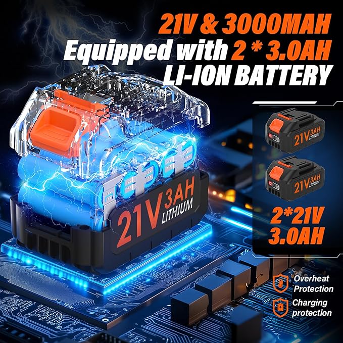 - ๐ ๐ฑ ๐.๐๐๐ก ๐๐๐ญ๐ญ๐๐ซ๐ฒ ๐๐ฒ๐ฌ๐ญ๐๐ฆ: It comes with two 3.0Ah batteries and a charger, allowing users to charge one battery while using the other. Low-speed operation lasts up to 80 minutes (40 minutes per battery). The batteries are equipped with an overheating protection device for safety and reliability.