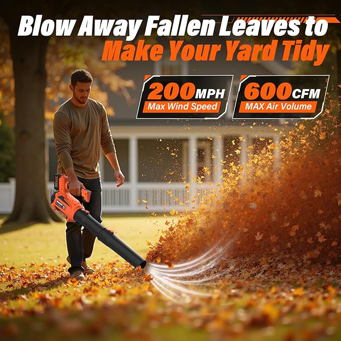 MAXLANDER Leaf Blower Cordless, Electric Cordless Leaf Blower with 2pcs 3.0Ah Batteries and 1 Charger, 600CFM & 200MPH, and 5 Speed Mode, for Patio Cleaning, Lawn Care, Blowing Fallen Leaves and Dust