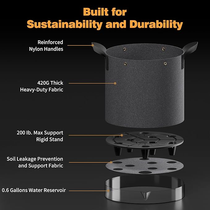 - Sturdy Fabric Material: Crafted 420G thickened nonwoven fabric with reinforced stitching nylon handles, PP rigid stand, PVC water reservoir and BPA-free, these heavy-duty fabric planters are sustainable and durable. Easily lift and move them without deformation