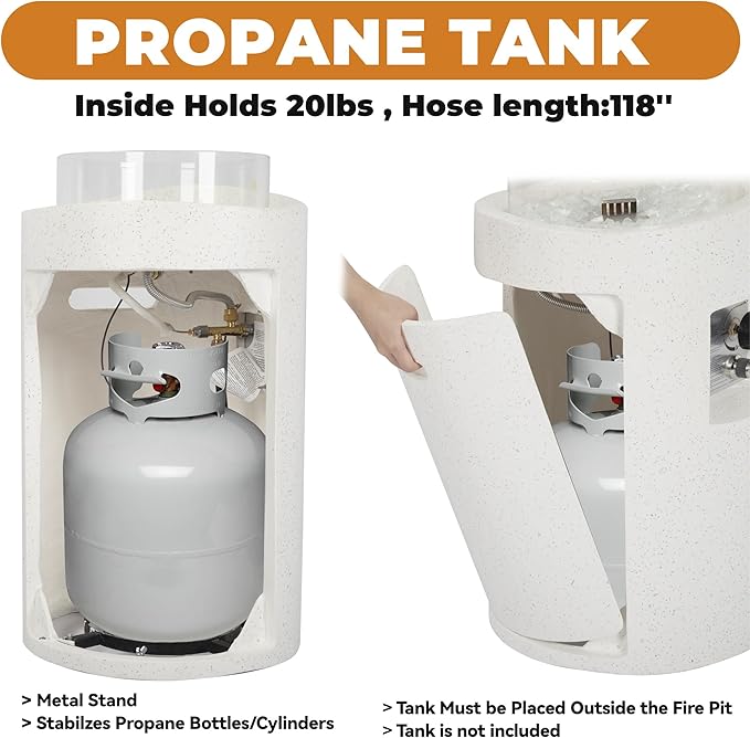 - 【Complete Accessories for Convenient Outdoor Use】Included accessories enhance both style and usability: glass beads, glass wind guard, and durable rain cover. The propane tank fits discreetly inside the fire pit base, keeping the setup clean, safe, and convenient for entertaining or relaxing
