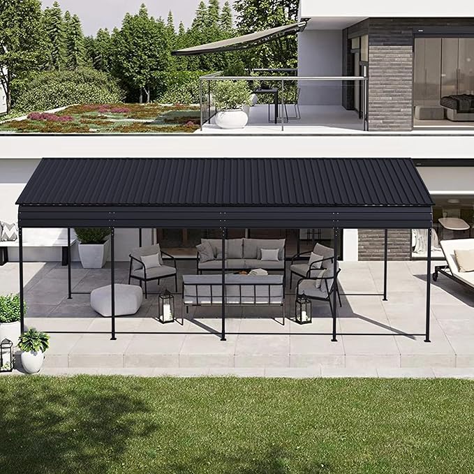 - Reinforced Steel Frame and Roof Panels Constructed with a rust-resistant steel frame and galvanized steel roof panels, this carport is built to withstand long-term outdoor exposure. The vertical roof design improves drainage and enhances durability for all-season coverage.