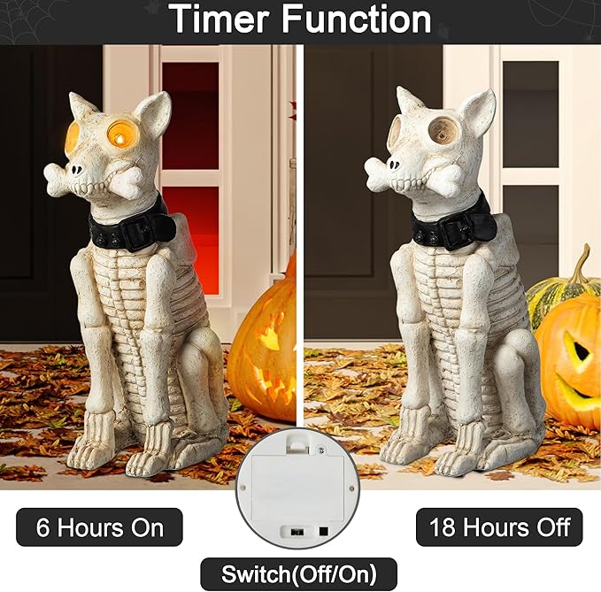 - [Eerie LED Skull Stack Design] --- This 20.5"H decor features three stacked MGO skeleton dog with six glowing LED bulbs embedded in the eye sockets, creating a striking and terrifying Halloween ambiance. Perfect for spooky displays!