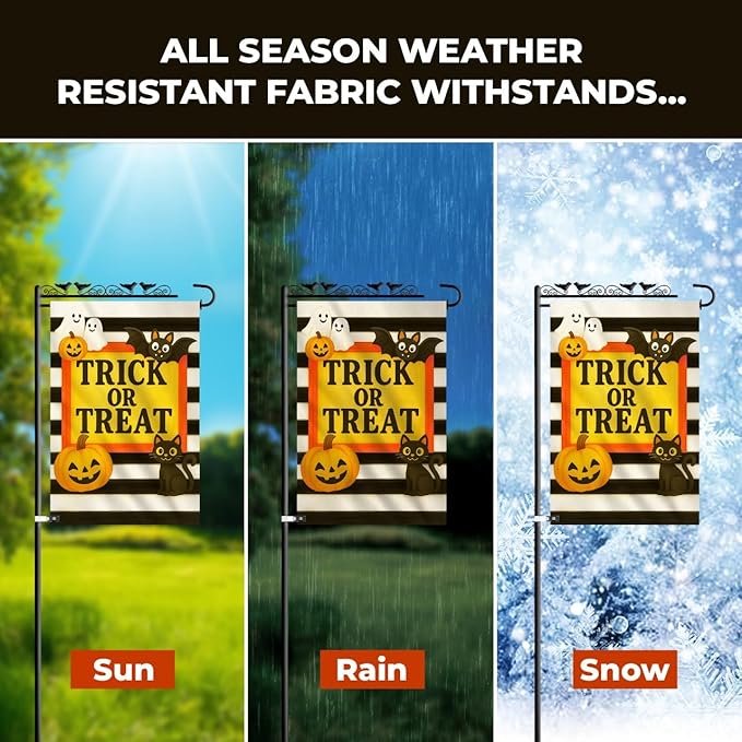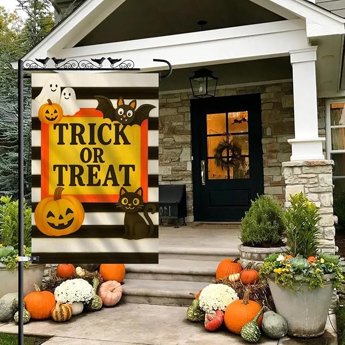 - Reusable Halloween Outdoor Décor – A festive choice among Halloween garden flags for outside, this bat and pumpkin “Trick or Treat” flag brings spooky fun to your lawn, porch, or garden year after year.