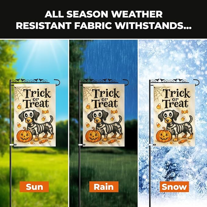 - Double-Sided High-Definition Print – Displays the same detailed skeleton dachshund artwork on both sides, ensuring your Halloween outdoor flag is visible from every angle.