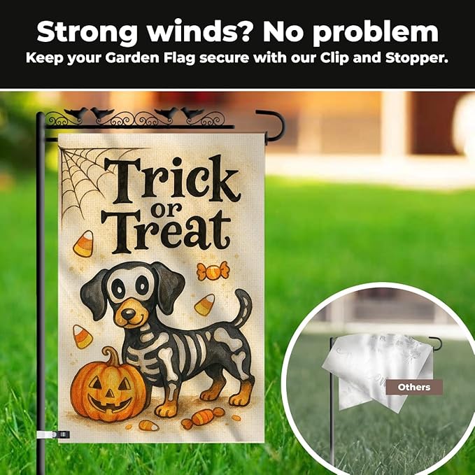 - Fits Standard 12x18 Garden Poles – Easily slides onto any standard flag stand, making your skeleton dog Halloween flag quick and simple to display.