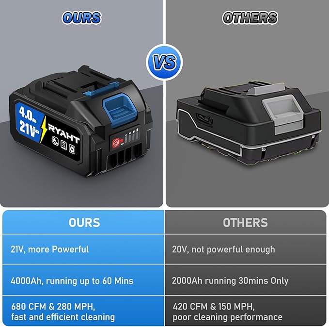 - Cordless Leaf Blower: RYAHT leaf blower, say goodbye to the limitations of traditional leaf blowers with ropes. The upgraded rubber grip offers non-slip support, making your work easier and comfortable. Suitable for patio, courtyards, parks, streets, etc. Efficiently clears leaves, lawn, snow, debris, dusting.