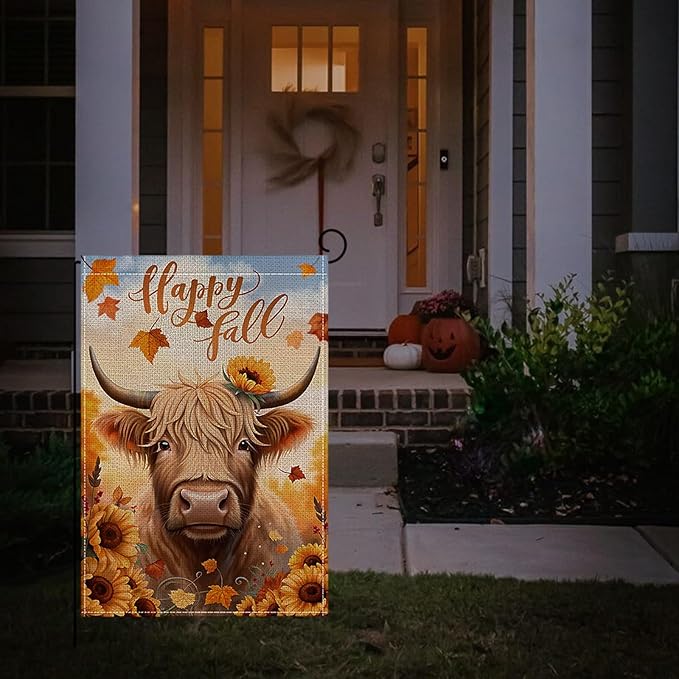 Fall Garden Flag 12 x 18 Inch Double Sided Cow Maple Leaves Sunflower Designs Autumn Burlap Yard Flag for Outside Rustic Yard Outdoor Holiday Home Decoration