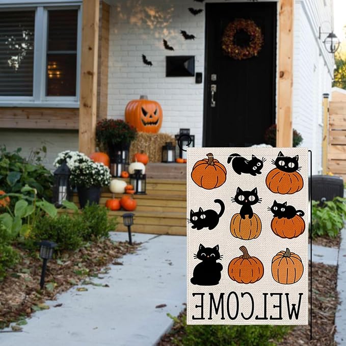 Halloween Garden Flag 12 x 18 Inch Double Sided Cute Cat Pumpkin Designs Fall Autumn Burlap Yard Flag for Outside Rustic Yard Outdoor Holiday Home Decoration