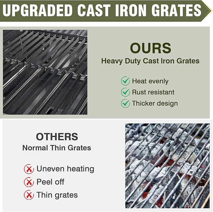 - 🌡️ 【Precision Control & Instant Start】 Push-button ignition fires up with a 20-lb propane tank. Adjustable knobs + built-in thermometer master low-and-slow or high-heat cooks. Key upgrade: Thick, wave-design oil-drain plates distribute heat evenly (no cold spots!) and channel grease away from flames.