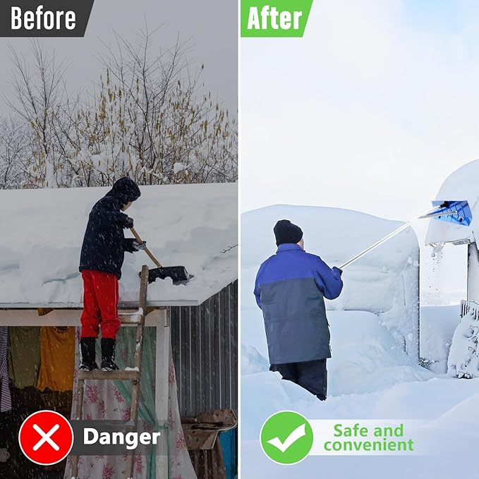 - Effortless Assembly Use: the snow roof rake package includes 1 handle pole and 4 extending poles, allowing for easily adjusting length depending on your height or the roof area targeted; The design offers simplicity and functionality, making the roof snow removal task less strenuous