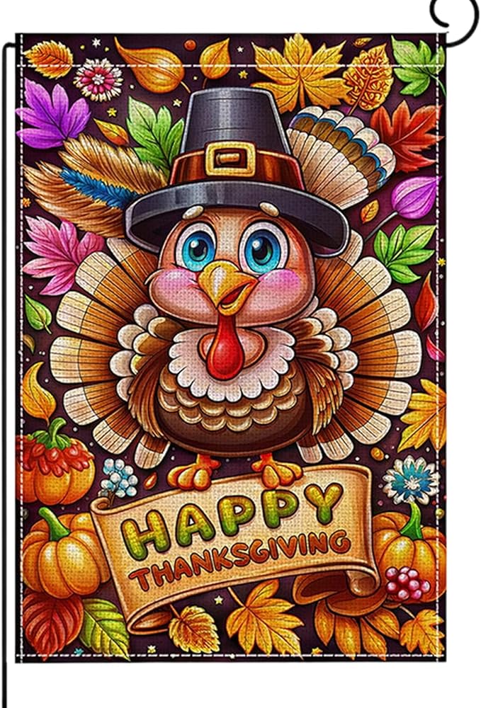 Fall Thanksgiving Garden Flag 12 x 18 Inch Double Sided Turkey Pumpkin Maple Leaves Designs Autumn Burlap Yard Flag for Outside Rustic Yard Outdoor Holiday Home Decoration