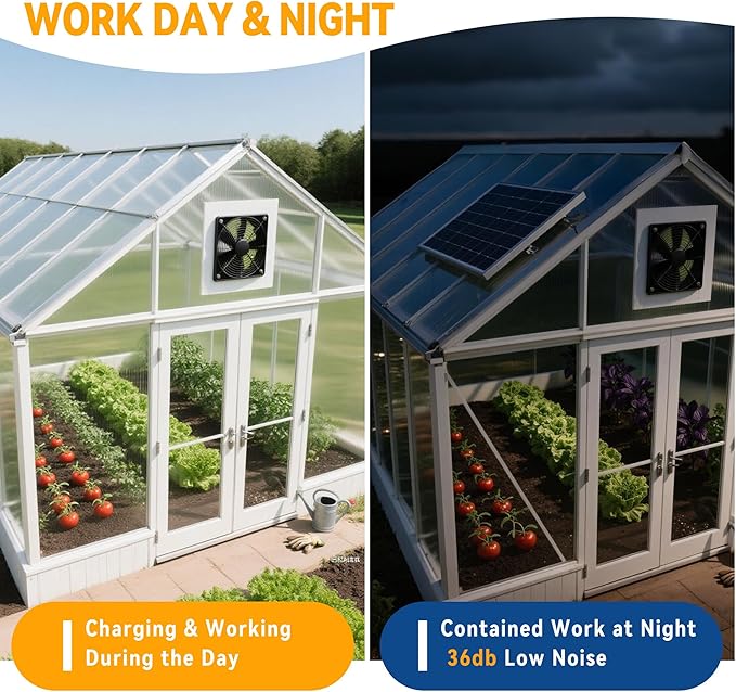 - 🏡 Multi-Scene Versatility: This solar fan is equipped with a extension DC cable. 36db low noise. Perfect for chicken coops, greenhouses, barns, tents, RVs, and garages, this solar powered fan with battery adapts to diverse environments to keep animals,plants, and people cool.