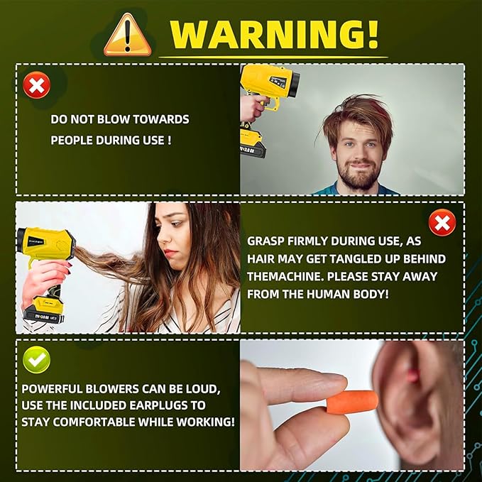 - 【Note】Portable Compact Air Blower Due to the strong wind, it will be accompanied by noise. In order to provide you with a quieter and more comfortable experience when working continuously for long periods of time and to protect your hearing, we have equipped you with noise-canceling earplugs.