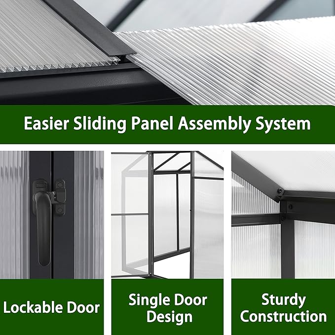 - Sturdy Aluminum Frame - Our outdoor greenhouse's deep gray powder-coated frame provides rust resistance, dirt resistance, and long-lasting durability. The frame is stable and not easy to blow down. You can add the tie-down kit to improve the wind resistance. Our use of high-quality greenhouse kits includes a lockable door and upgraded metal hinges ensuring convenience and security for your greenhouse