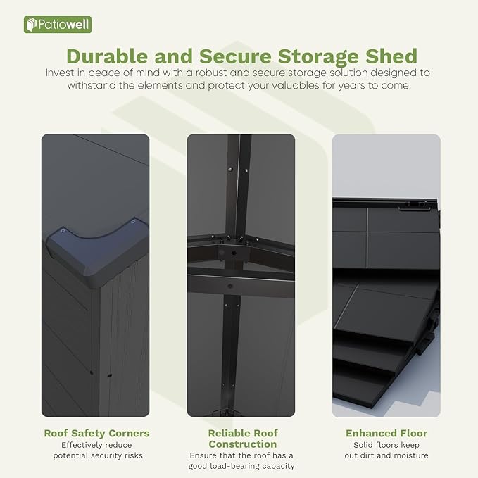- Secure & Weatherproof Storage Solution: Engineered for protection, this shed features a lockable door for security and a peak roof design that prevents water accumulation. The seamless interlocking panels create a tight barrier against rain, wind, and dust, ensuring your belongings stay dry and protected year-round.