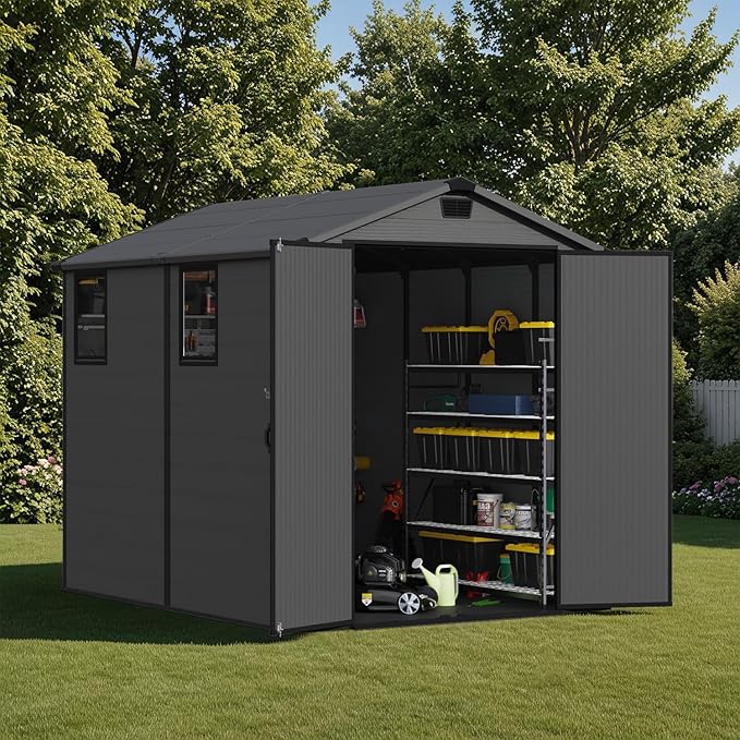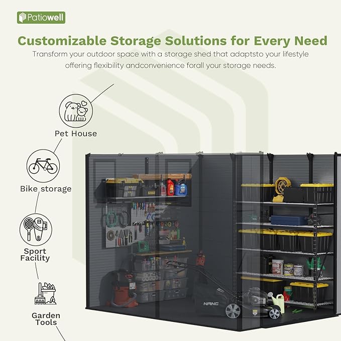 - All-Weather Durability & UV Protection: Built to last, this heavy-duty shed features UV-resistant plastic panels and a reinforced resin floor that stand up to intense sunlight, heavy rain, and strong winds. The waterproof, corrosion-proof construction resists warping, cracking, and fading—keeping your tools, equipment, and outdoor gear protected season after season.