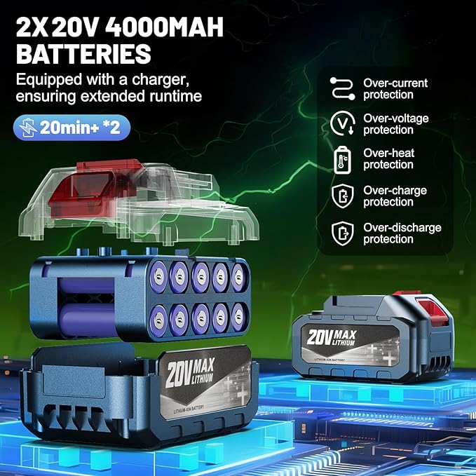 - 【2*4.0Ah Batteries for 40+ Minutes Runtime】The leaf blower cordless with battery and charger system includes two 20V lithium batteries providing 40+ minutes runtime totally. This battery powered leaf blower ensures uninterrupted operation for extensive property maintenance.