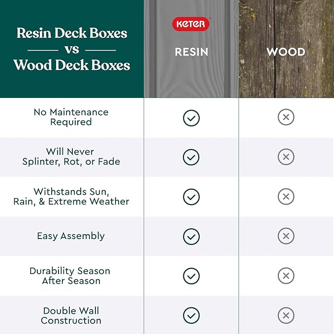 - DURABLE & ATTRACTIVE RESIN CABINET: This deck storage box is attractive and rugged and is made from strong, durable resin with a wood-plank look. It has an easy-lift mechanism for an effortless open and a quiet close.