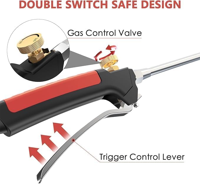 - 【Excellent material & advanced flame control】This Weed Burner Torch combines excellent material quality with advanced flame control, crafted from refractory steel for exceptional durability to withstand high-temperature conditions. It features a 40 inch detachable arm for easy storage and safe operation at a comfortable distance, along with an integrated igniter for quick, hassle-free flame ignition. The gas valve and turbocharger trigger enable precise one-hand flame adjustment, while the 10ft CSA-certified stainless steel braided propane hose with a 100% solid brass connector ensures a secure, leakage-free connection for reliable use.