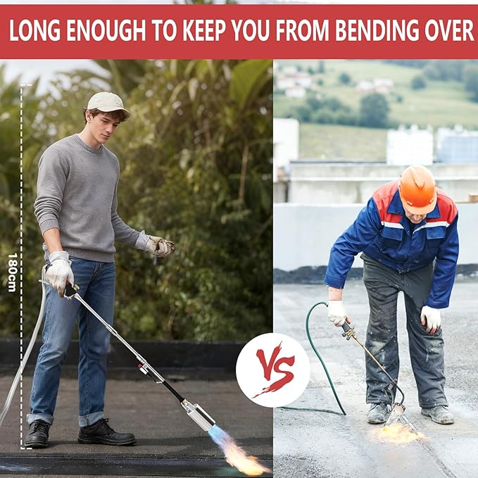- 【Wider Application】Multi-Purpose Propane Torch: More Than Just a Weed Burner for burning thorns, weeds and stumps, melting snow and ice,removing parking lot markings and paint, starting a camfire, searing meat or fish, soldering, do wood grain burning, thawing frozen pipes and equipment, melting tar and asphalt, repairing roof and various woodworking projects, removing paint from non-flammable surfaces and more.