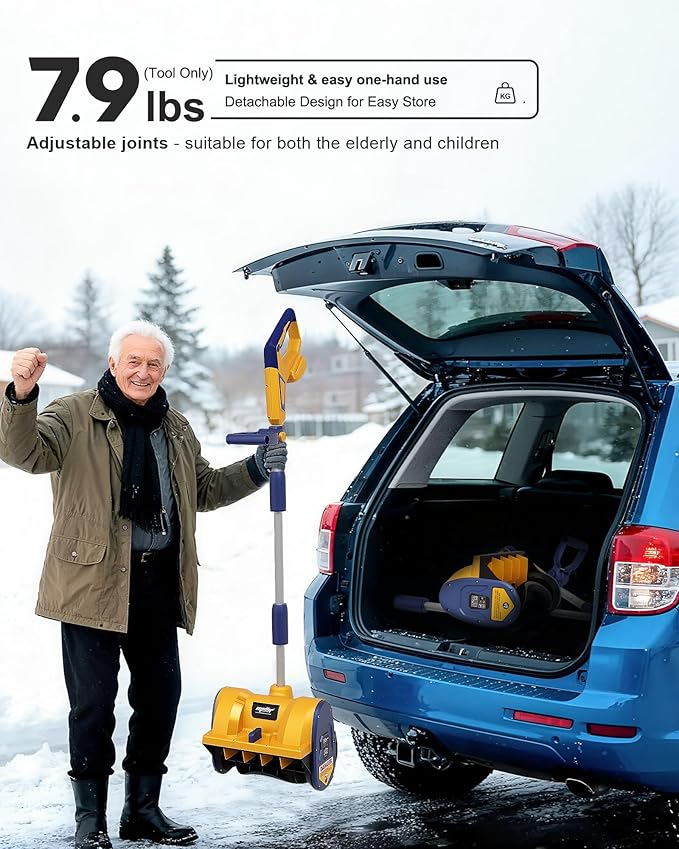 - Lightweight & Adjustable Design: Weighing only 7.9 lbs (without battery), this snow shovel reduces fatigue for long use. 60° adjustable chute controls snow direction easily(left, right, or straight), while the detachable design makes storage simple