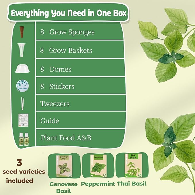 - Everything You Need to Start Growing: Comes with 8 grow sponges, baskets, domes, light - blocking stickers, A&B plant food, tweezers, 3 kinds of seeds, and a grow guide - no extra tools required