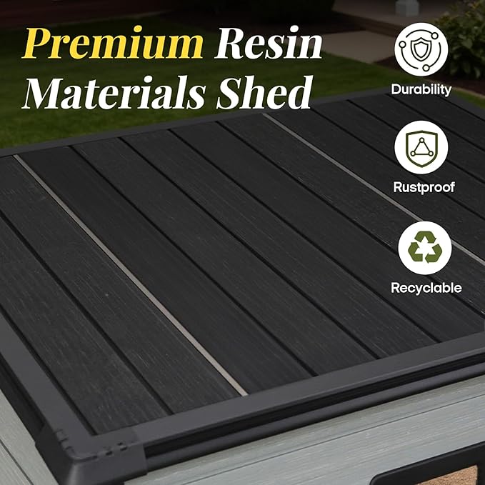 - Weather Resistance: Crafted from durable resin material, this outdoor shed offers excellent weather resistance, ensuring your belongings stay safe and protected year-round. The UV-resistant exterior finish ensures long-lasting color vibrancy and protection against fading caused by sun exposure.