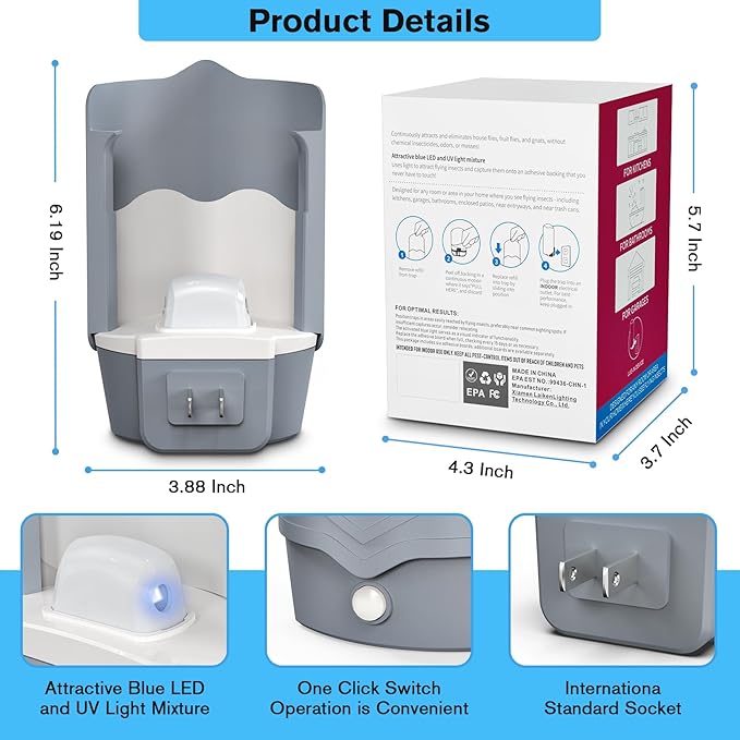 - Fast Fly Capture: Blue and UV light attract flies, fruit flies, moths, and gnats quickly, providing rapid pest control