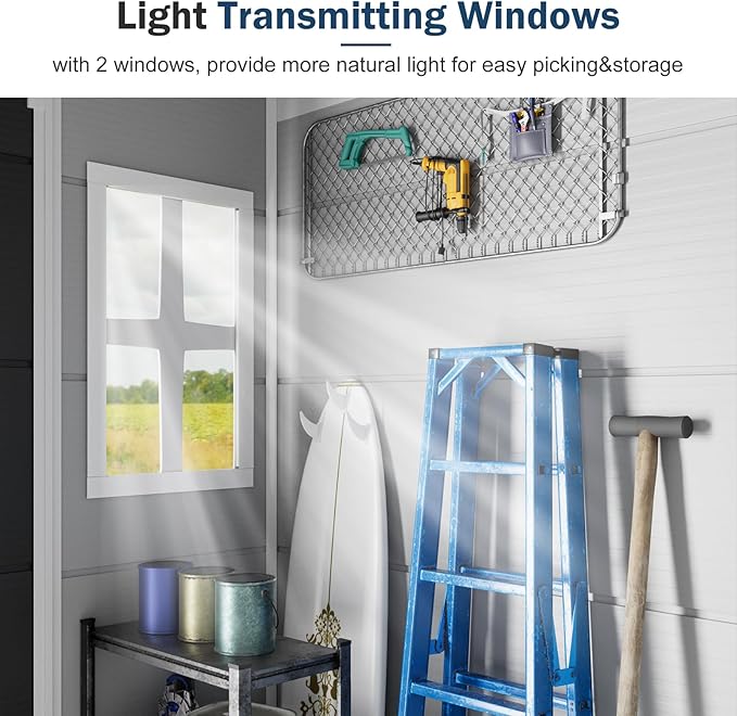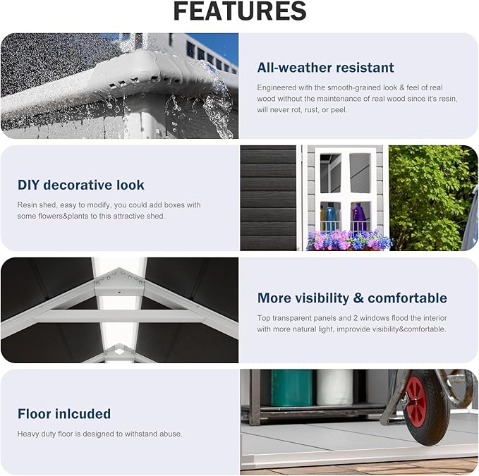 - Weather Resistant: Resin and plastic mix material with painted outter, make the storage shed waterproof. All parts are plug in tightly. We also provide silicone sealant to make the panels fit more tight and prevent potential leaks.