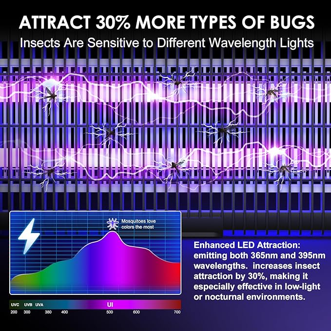 - 【Enhanced LED Attraction】:This Mosquito lamp is equipped with dual-color LED lights emitting both 365nm and 395nm wavelengths. The dual-color LED system increases insect attraction by 30%, making it especially effective in low-light or nocturnal environments.