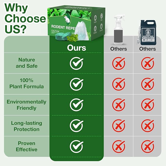 - 【Safe and Environmentally Friendly】This mouse rodent repellent is economical and environmentally friendly. All ingredients are from natural plants, which are naturally safe and harmless. It is very friendly to humans, family, pets and the surrounding environment. It is especially suitable for rodent repelling indoors, enabling you to use it with confidence.