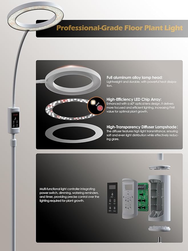 - 【Adjustable Height & Enlarged Lamp Head】LED Floor Grow Light G5 extends up to 70.87 inches, ideal for plants of various heights. The enlarged lamp head and 360° flexible gooseneck allow broader light coverage and precise angle adjustments, ensuring efficient and customized lighting.