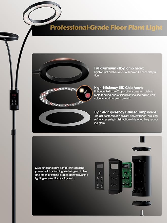 - 【Adjustable Height & Enlarged Lamp Head】LED Floor Grow Light G5 extends up to 70.87 inches, ideal for plants of various heights. The enlarged lamp head and 360° flexible gooseneck allow broader light coverage and precise angle adjustments, ensuring efficient and customized lighting.