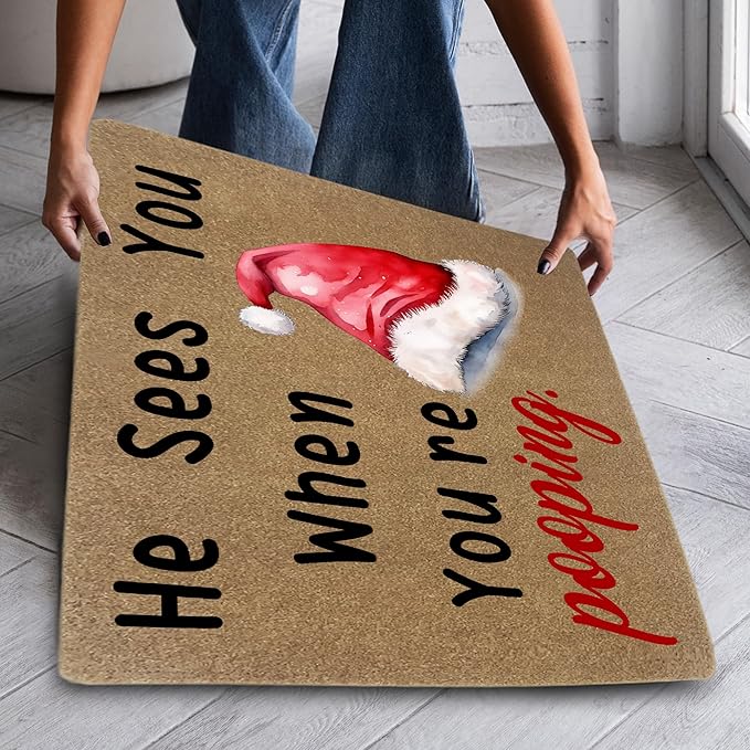Funny Christmas Bathroom Faux Coir Door Mat, Christmas Bath Mat for Bathroom Entryway, He Sees You When You're Pooping Welcome Doormat for Washroom Restroom Toilet Porch Entrance, 17x30 Inch