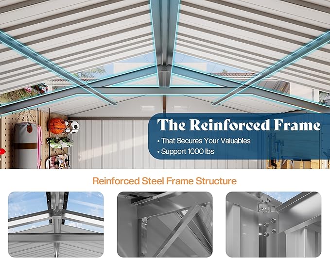 - Weatherproof Outdoor Shed: Constructed from 0.25mm thick galvanized steel, this metal shed features reinforced roof beams withstand wind and rain. Additionally, all screws come with washers to ensure a waterproof seal