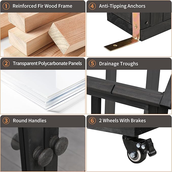 - Durable Fir Wood & Polycarbonate Panels – Built with 100% natural fir wood and UV-resistant polycarbonate panels that diffuse sunlight evenly, protecting plants from harsh rays while maintaining optimal growth conditions for seedlings, herbs, and winter crops.