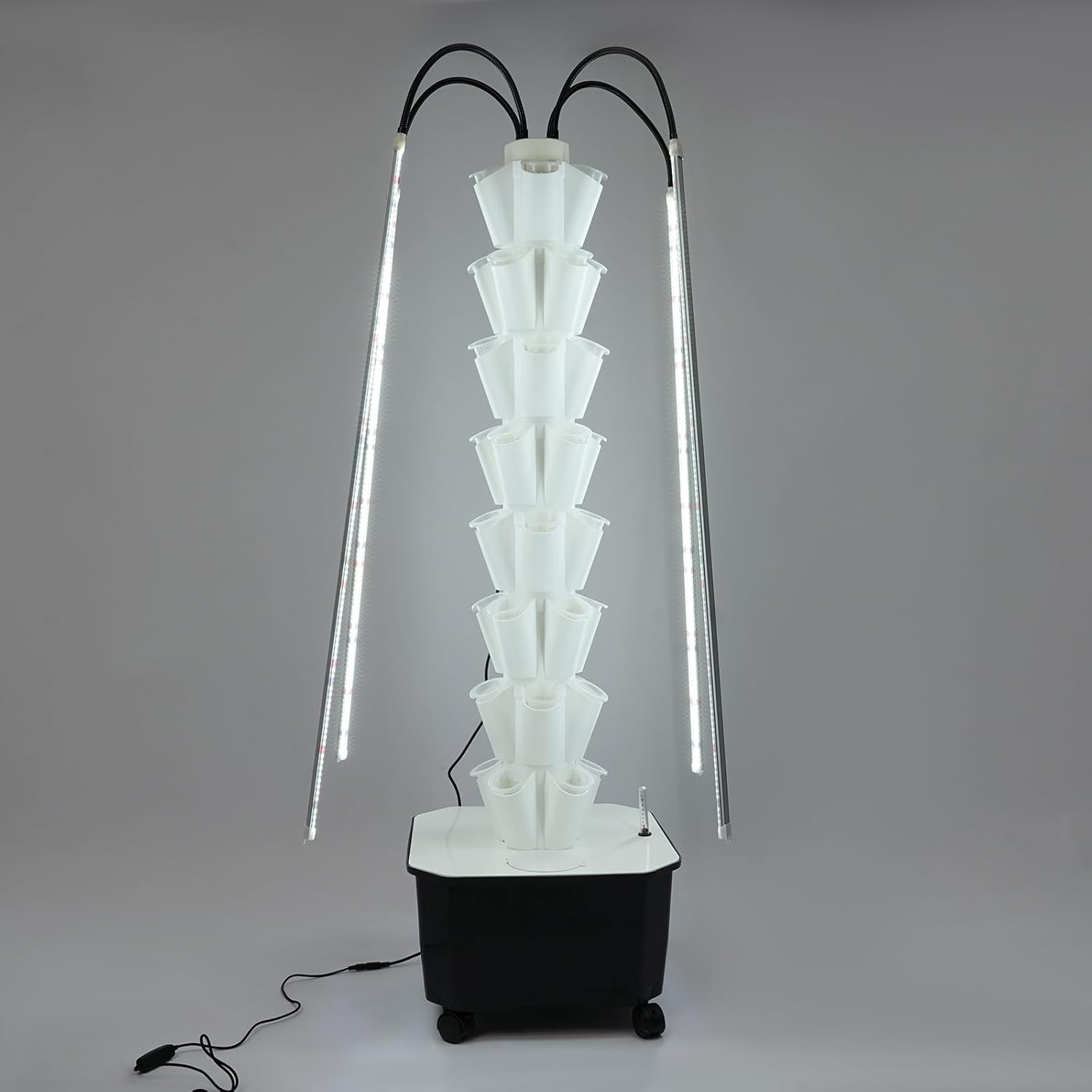 • 【Maximize Your Yield】: Go vertical with eight levels of growing space and 40 planting sites. This design lets you grow more plants in less space. Plus, the included grow lights provide 360-degree illumination, ensuring your plants thrive, even on cloudy days.